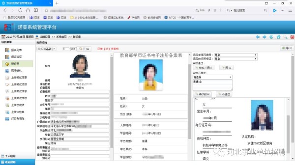 上面这张图就是后台审核人员用的“工作界面”,这套软件可以根据你填写的身份证号、学历验证码、教师资格证编号等信息,与教育部学信网、教师资格网数据库进行比对,一目了然。一般情况下每名后台审核人员每天可以审核300人左右(轻松又惬意,还有时间休息喝茶,感慨一下:科技改变工作)