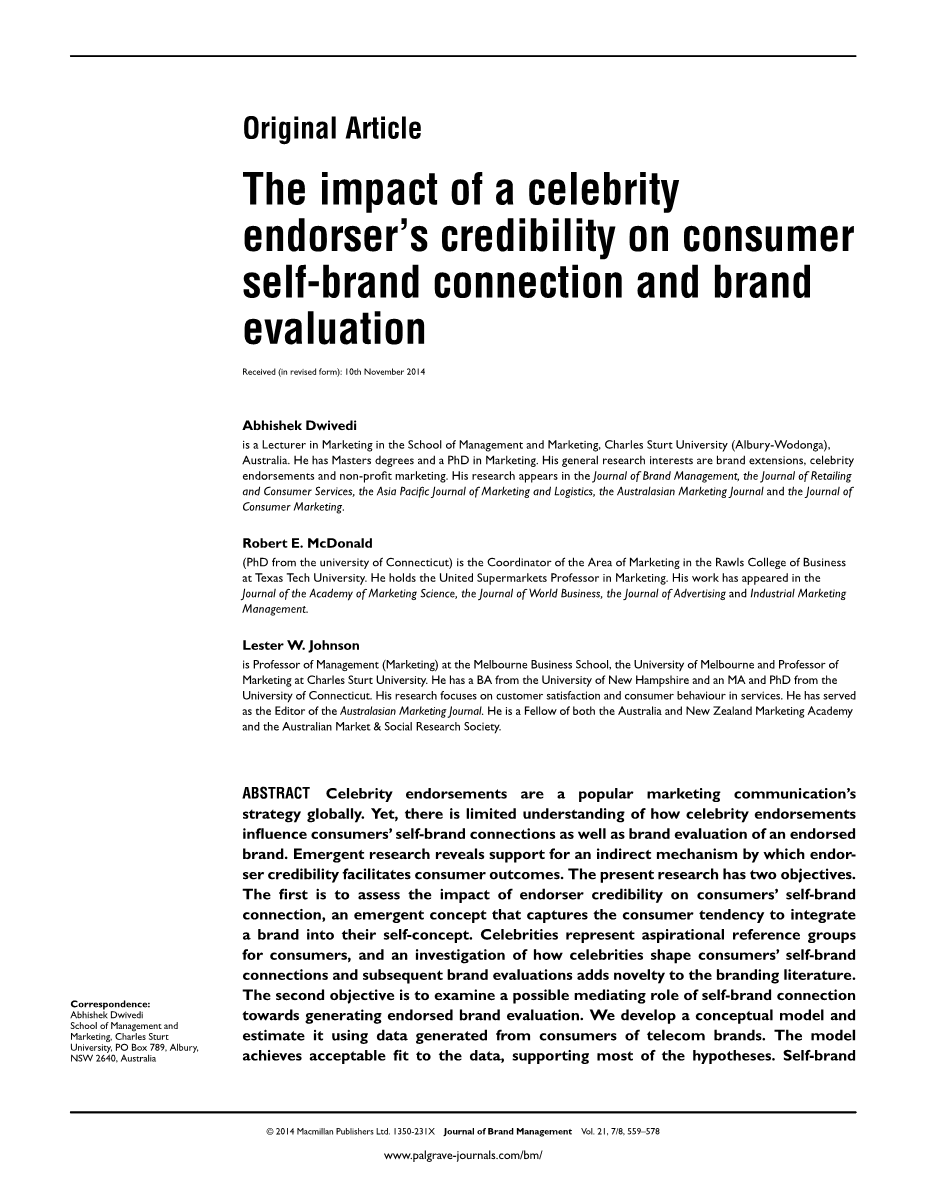 明星代言人可信度对消费者自我品牌连接和品牌评价的影响外文翻译资料