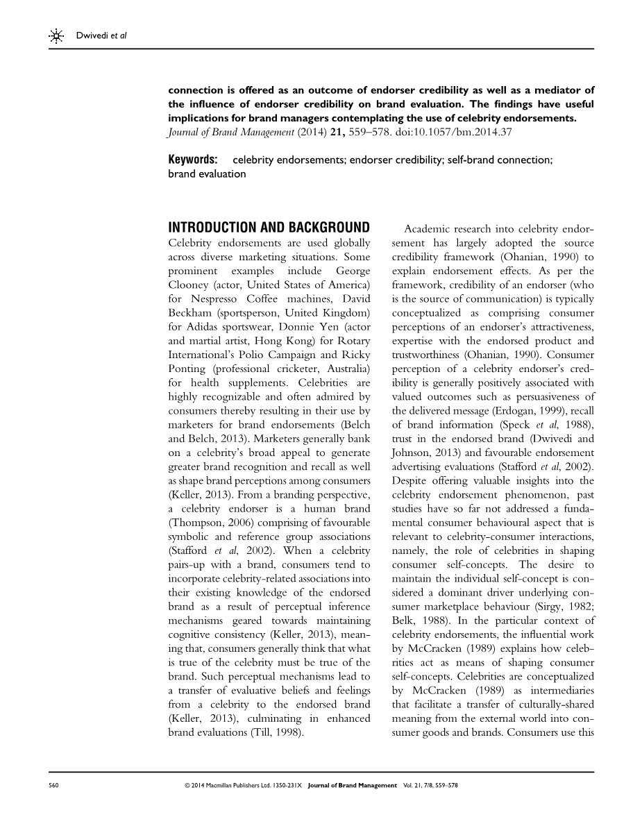 连接。从理论上讲,结果将更好地了解如何求和者来自的适当品牌协会名人以建构和融合传达自己的自我概念,从而解决文献中的电话更多关于该问题的实证研究(Escalas和Bettman,2003年)。 另外,本研究将扩大范围研究态度对名人代言的影响日记和行为结果(用于考试-例如,品牌态度和购买意图)更基本的消费者自我概念相关结果。从管理上讲,结果可能会告知品牌经理名人代言人可能拥有影响消费者的更大潜力,甚至比以前想象的要多。名人可能不会仅有助于产生增强的品牌,如先前所认为的认可和回忆,但也可能会建立更持久的情绪