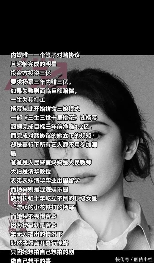 离婚与“姐狗”叙事:2018年离婚,时间点在她对赌协议完成、彻底掌握商业主动权之后。离婚后,与魏大勋的“勋幂恋”传闻(被拍同框、游戏互动、文案暗合)持续数年,虽未官宣,但成功塑造了“潇洒姐姐”的新形象,契合女性意识崛起的舆论环境。近年,与旗下艺人(如张云龙)的互动,也被解读为新人助推策略的一部分。 (4) 资本进阶:从“商品”到“老板”的惊险一跃 这是杨幂人生中最具战略意义的章节。 · 对赌传奇:2015年,尚世影业以3亿元收购杨幂持股的嘉行传媒部分股权,附有三年税后净利润累计不低于3.1亿的对赌协议。彼时嘉行估值仅2500万。杨幂带领团队开启“劳模模式”,以《翻译官》《三生三世十里桃花》等剧超额完成对赌,最终将嘉行估值推至50亿。这场博弈,让她从被资本挑选的演员,跃升为规则的制定者之一。 · 利益共同体:她与经纪人曾嘉、赵若尧的铁三角关系极为稳固。曾嘉曾任荣信达(李小婉公司)经纪人,赵若尧是其助理,这种从老牌公司带出的核心班底,构成了她商业帝国的基石。 · 资本脱身:2023年起,她陆续退出与嘉行相关的多家公司股东行列,被普遍解读为“去嘉行化”,谋求更独立的资本布局。此举与早年范冰冰的路径相似,旨在剥离中间层,直接对接核心资源。 (5) 人际网络:建立在资源之上的“幂军团” 杨幂的圈内关系以实用主义为底色。 · “泰迪姐妹团”兴衰:早期以霍思燕、秦岚等为核心的姐妹团,随着各自发展路径和资源竞争而自然消散,是娱乐圈友情塑料性的经典案例。 · “剑三”游戏圈:与张大大、Angelababy等人的游戏闺蜜团,更多是顶流间的社交联盟与话题共生。 · 造星流水线:通过嘉行自制剧批量“嘉行大礼包”带新人(迪丽热巴、张彬彬等),是典型的资源内部转化模式。但随着头部艺人出走,此模式已现疲态。 · 与主流圈的距离:尽管商业成功毋庸置疑,但她与正统的奖项圈、导演圈(如京圈、西北圈)始终存在若即若离的隔阂,这也解释了为何其电影资源多以商业片为主。 六、 舆论战场:自黑、人设与精准“提纯” 杨幂是内娱“自黑式营销”的开创者。从“脚臭”梗到“发际线”梗,她将黑点转化为记忆点,消解了攻击性。她的人设迭代清晰:从“小狐狸”到“少女妈”,再到“人间清醒大女主”,每一步都踩中社会情绪。“诈捐门”等负面事件曾带来冲击,但均通过法律手段和时间淡化得以处理。在粉丝管理上,她团队深谙“提纯”之道,能巧妙引导CP粉、事业粉、颜粉各司其职,形成强大的数据生产力。 隐秘传闻与悬案 1. “二王”争夺战:早年传闻港圈大佬(被影射为JMJ)与内地资本方(WC)曾为她进行资源争夺,此事真假难辨,但侧面印证其作为“顶级商品”时期的市场价值。 2. 健康状况谜团:常年被传患有卵巢囊肿等女性疾病,且因工作强度大难以根治,团队对此类传闻一律冷处理。 3. 资产转移疑云:离婚前后,关于其通过信托、海外账户进行资产安排的传闻不断,凸显了顶流艺人在私人财富管理上的复杂操作。 结语:顶级样本的非线性人生 杨幂的故事,彻底打破了“美貌+运气”的简单成功学。她展示了一个顶级艺人如何将个人特质(高情商、强心脏、风险承受力)与时代机遇(流量崛起、资本涌入、平台制播)进行最大化耦合。她的每一次转身——结婚、离婚、对赌、拆伙——都非情感驱动,而是冷静的商业决策。她身上凝聚了所有行业悖论:既要保持神秘,又要维持曝光;既是资本宠儿,又需警惕被反噬;既是流量女王,又渴望艺术正名。 如今的杨幂,已进入“后资本”阶段。她不再需要证明自己的商业价值,而是要解答更终极的问题:在构建了一个庞大的商业版图后,作为演员的终极遗产是什么?作为“杨幂”这个超级IP,其生命周期如何超越生理年龄的限制?她的下一步,将不再是内娱的生存指南,而是成为一则关于“顶峰之后”的行业寓言。