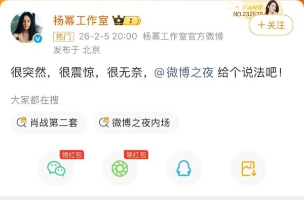 当晚,杨幂工作室突然发文:"很突然,很震惊,很无奈,微博之夜给个说法吧!"短短15个字,直接将矛头对准主办方。截至当晚9时,这条博文点赞量飙升至145万,评论区瞬间沦陷。