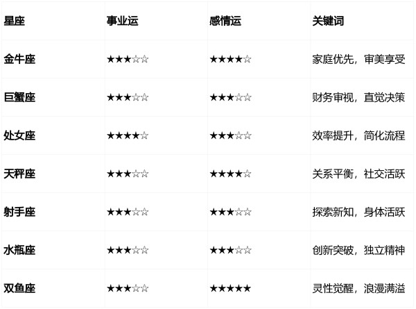 - 人际关系:周二至周四小误会易升级,避免在情绪激动时做重大决定