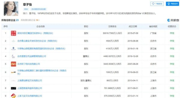 章子怡和汪峰宣布离婚的消息引起了广泛关注。这对明星夫妻近两年作品较少,章子怡忙于投资生意。她是一位热衷于投资科技公司的明星。根据天眼查的数据,章子怡与23家企业有关联,其中13家仍在运营,涵盖影视文化、科技、投资管理等领域。作为一名有份额的有限合伙人,她的科技企业投资估值和市值总计超过2500亿元。她投资了芯片、新能源汽车、人工智能等多个领域的公司。