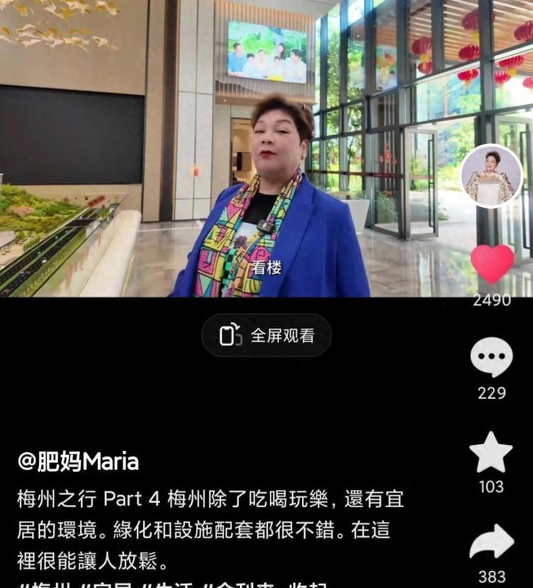 6月3号,知名港星肥妈玛利亚在自己的社交账号上发了一段视频,她提到自己去梅州看房,忍不住称赞那里的环境特别好,绿化和配套设施都很不错,让人感到特别放松。