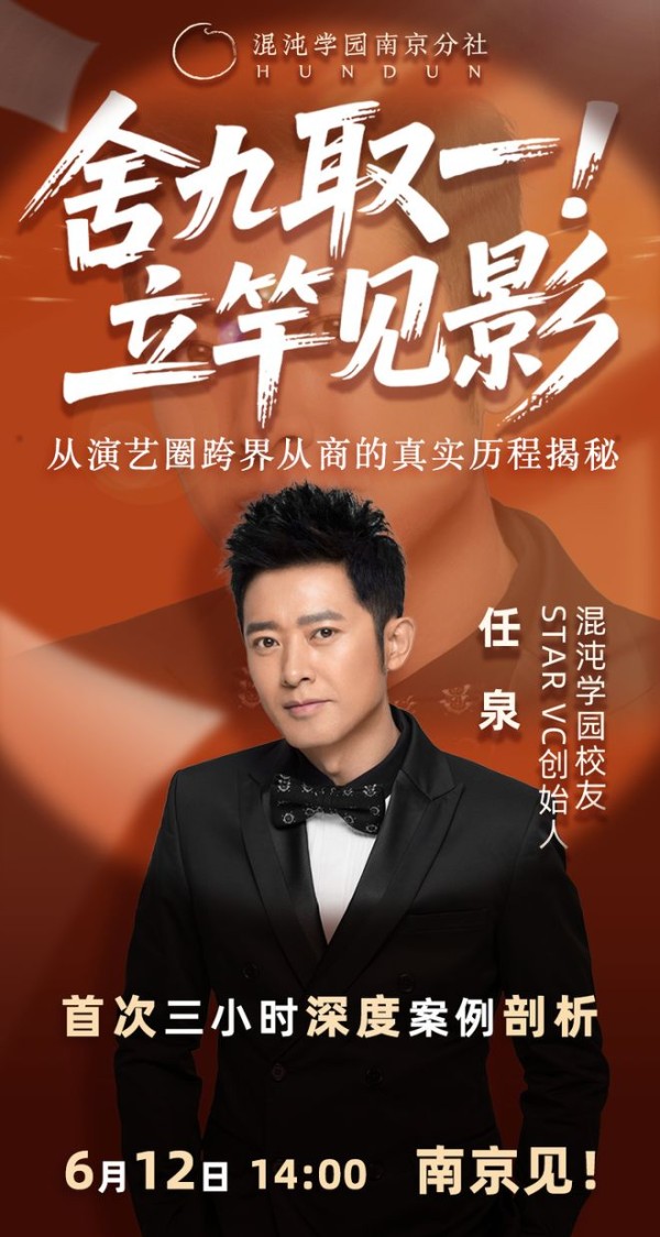 6月12日14:00,Star VC创始人任泉混沌南京开讲:《舍九取一,立竿见影——从演艺圈跨界从商的真实历程揭秘》!这是这位低调的投资人近些年罕见的公开分享,不容错过!