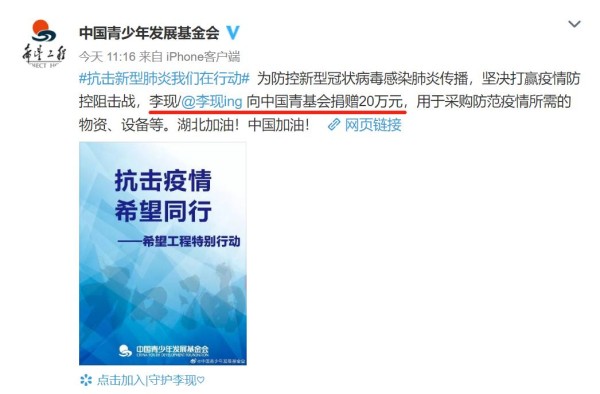 对于明星捐款,网友最为关注的当属时下当红明星的捐资额,女星中杨紫捐款50万、杨幂捐款20万、baby与老公捐款100万已是众多周知的事情,男星中肖战暂无消息,王一博通过天天兄弟及韩红方捐款,而在今天1月28日李现的捐款金额终于曝光,通过中国青少年发展基金会捐款20万元,作为湖北籍明星李现支援家乡令人感动。