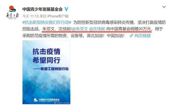 百位明星向武汉捐款,张庭夫妇捐款2000万,黄晓明夫妇追加80万
