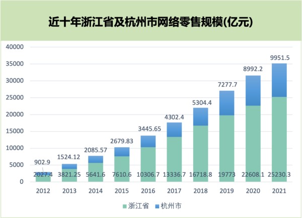 过去十年间,杭州市网络零售规模从2012年的902.9亿元增长至2021年9951.5亿元,实现了10倍以上的跨越式增长,成为国内电商产业产业发展最快的城市。政策利好下,杭州市直播电商产业进入快速发展期,2021年,直播电商交易额占比已达到电商总额的68.1%,领跑全国。