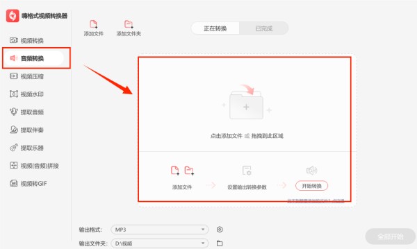 Step1:打开嗨格式视频转换器软件,点击页面中的“音频转换”板块,接着按照文字指示,通过点击或直接拖拽的方式,添加所需进行格式转换的OGG音频文件至图标所示处。它支持OGG、M4A、FLAC等多种音频格式的无损转换,能够满足用户多样化的需求。