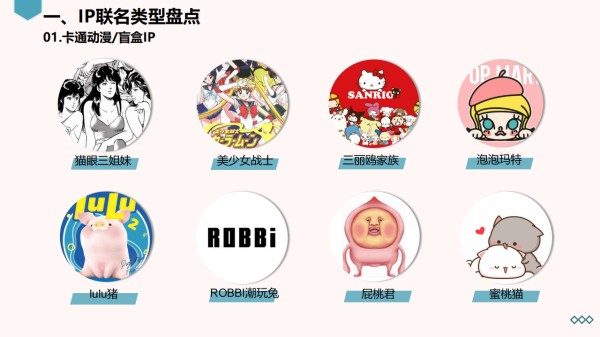 - 卡通动漫/盲盒IP:包括宝可梦、小黄人、海绵宝宝、猫和老鼠、HelloKitty、樱桃小丸子、哆啦A梦、草莓熊、愤怒的小鸟、迪士尼系列、猫眼三姐妹、美少女战士、三丽鸥家族、泡泡玛特、lulu猪、ROBBI潮玩兔、屁桃君、蜜桃猫等。