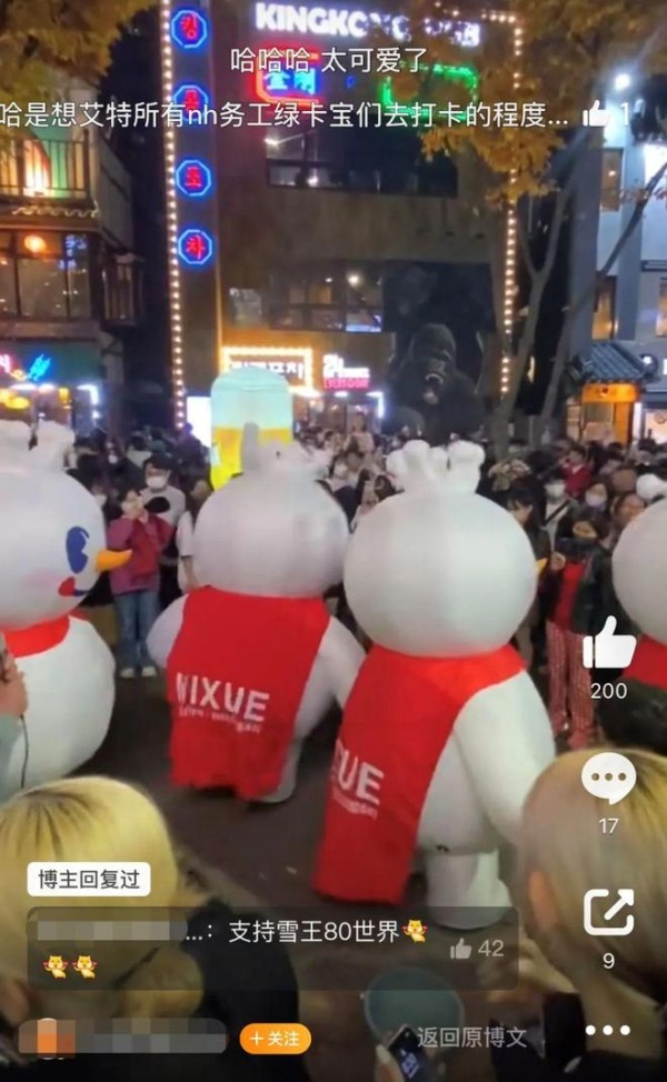 近日,当喜茶旗下喜小茶门店全关,“雪王”却将门店开到了韩国中央大学门口。街溜子“雪王”走上韩国街头,四五个雪王一起,在韩国街头排排站,与街上的路人互动,还会开心蹦迪,场面十分热闹和壮观。街上人头攒动,路人纷纷被雪王吸引,合影拍照,握手嬉戏,可爱的雪王在韩国街头火出圈。