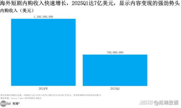用户“长短视频联动消费”已成常态——据QuestMobile《2025年剧综短视频消费内容和行为报告》,75.4%用户“看剧时同步刷剧综短视频”,59.9%用户“看完剧后继续刷相关短视频”;海外短剧变现能力更突出,Sensor Tower《2025海外短剧行业报告》显示,2024年内购收入15亿美元,2025年Q1直接突破7亿美元,相当于3个月完成去年近一半收入,商业化潜力显著。