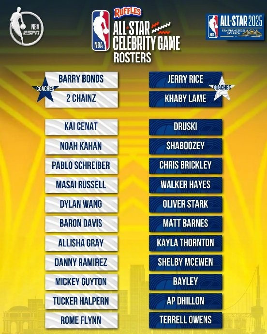 【2025NBA全明星名人赛名单公布 中国演员王鹤棣再次参赛】NBA官方公布了2025年全明星名人赛参赛名单,比赛将2月15日早8点在加州奥克兰的奥克兰球馆进行。