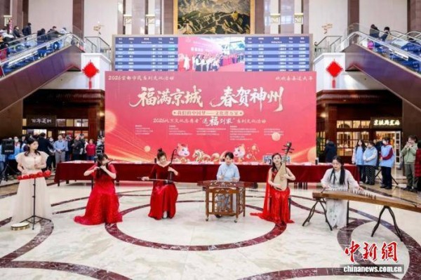 上午10时,北京站一楼候车大厅内红韵融融、暖意流淌,“福满京城 春贺神州”2026年北京文化志愿者“送福到家”系列活动在此正式启动,也拉开了北京站“温暖回家路·文化伴你行”春运主题文化活动的帷幕。一段精心编排的民乐暖场表演率先点燃气氛。《茉莉花》婉转悠扬,《金蛇狂舞》喜庆欢腾,二胡、琵琶、笛子等乐器接连奏响经典旋律,为候车旅客带来一场高水准的听觉享受。“没想到在车站还能听到这么专业的演出,一下子就有过年的感觉了,等车也不觉得着急了。”准备回秦皇岛过年的王女士笑着说。