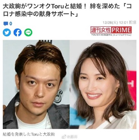 今年2月,大政绚正式迈过30岁的门槛,Toru也已经三十三岁了,所以两人就一拍即合。两人的好友都表示他们是一对俊男美女,周围的人都希望他们最终能够结婚。
