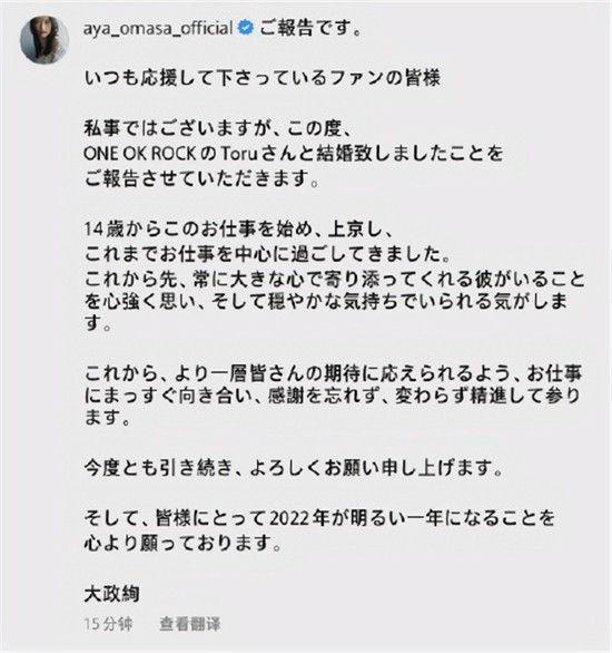 大政绚和ONE OK ROCK乐队吉他手Toru公布了结婚喜讯。照片中大政绚穿着一件简单的白色衬衫,披着长发,Toru则是一如既往的摇滚风,黑色皮衣和黄色头发让他显得格外不羁。分享的照片中,大政绚和Toru相视一笑,大政绚笑得格外灿烂,眼睛里是藏都藏不住的爱意。两人站在一起,黑白配的情侣穿搭格外登对。