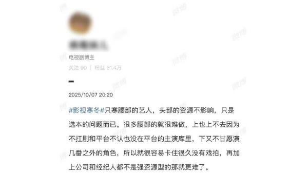 腰部艺人的困境,既是市场的无情,也是行业的自我修复。资源去哪了,观众的眼睛最亮。谁有流量、谁有实力,清清楚楚。现在平台押头部,短剧给新人,腰部艺人夹在中间,不上不下。行业冷风一吹,谁能站住脚谁能坚持到底,全靠真本事。