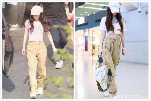 首先是这套简单的白色短T恤搭配了黄色的工装裤,baby和杨幂两个人几乎全身都是一样的搭配。而这套装扮其实是baby先穿的,两个人之间隔了有5天,所以这一套并不是baby在模仿杨幂的穿搭。