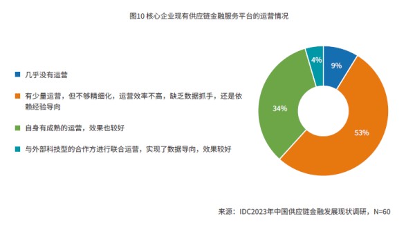 有了平台和风控后,如何将平台有效运营起来更为关键。核心企业需将产品运营、用户运营、渠道运营、数据运营等有机结合、形成体系,才能最终为客户创造持续的价值。但仍有53.2%的受访者反馈,现有供应链金融服务平台有少量运营,还不够精细化,运营效率不高,缺乏数据抓手,还是依赖经验导向。另有8.5%的受访者反馈,几乎没有运营。