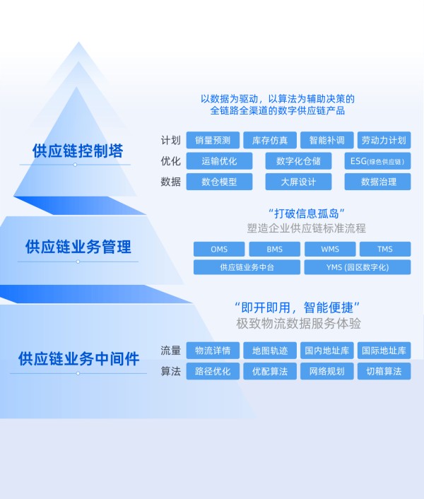 智能化的供应链业务管理系统,包含订单管理系统(OMS),仓储管理系统(WMS),运输管理系统(TMS),结算管理系统(BMS),实现供应链信息集成化、作业自动化、决策智能化,旨在提升物流效率、降低成本、优化服务体验。