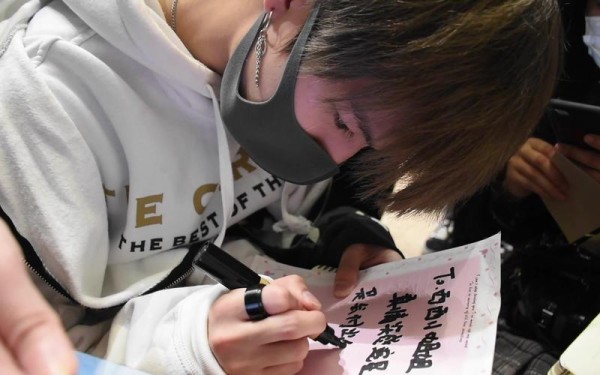 摘下帽子与口罩,他深深鞠躬,以示感谢。粉丝们递来的信件与礼物,他双手恭敬地接下,并一一回应。 当有人热情地请求他签名时,他也毫不吝啬地一一满足。