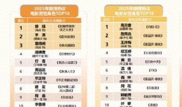新浪公布了2025年度电影白皮书,类似于通过全年在社交平台上收集的大数据,进行整理和总结,形成了若干排行榜。在这些榜单中,有两组特别引人关注,且具备讨论价值——