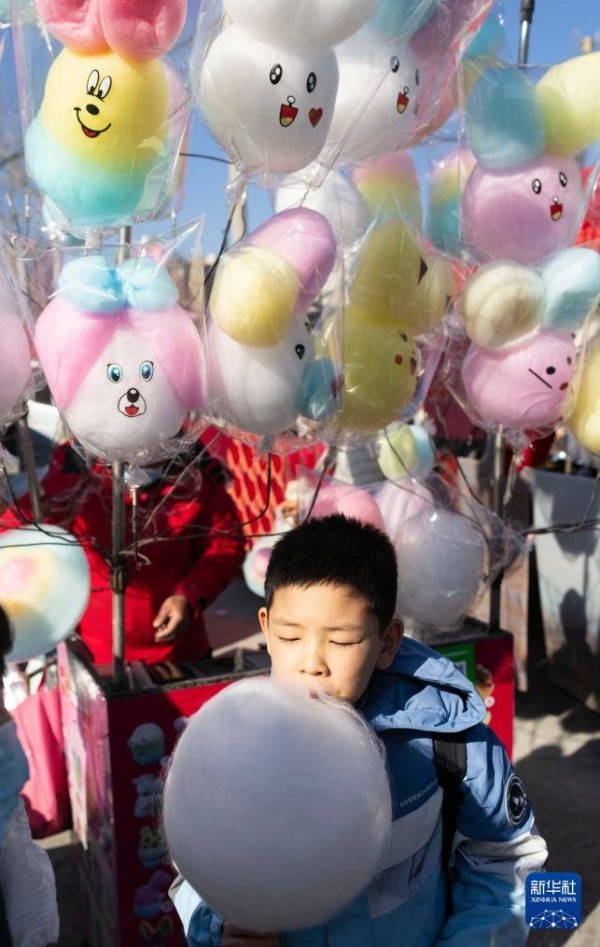 在北京市昌平区沙河大集,一名儿童在吃棉花糖(2月8日摄)。