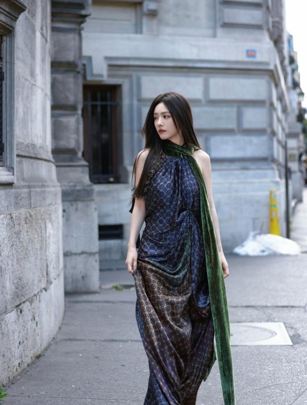 巴黎的石板路上,风吹过那条印花丝绒长裙的边角,仿佛时间也跟着轻轻摇晃。