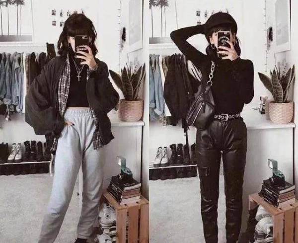 黑色,朋克风的代表色。紧身短款内搭,非常的时尚,很多女人会选择这种款式的衣服来展现自己的身材,既时尚又酷帅。穿一件小格纹衬衫,有休闲中性风,外穿一件黑色夹克,搭配一条灰色松紧运动裤,叠穿是流行时尚的穿搭方式,整体的搭配显高,十分的酷帅。而黑色紧身针织衫搭配紧身皮裤,用一条金属皮带做点缀,中和掉整体黑的沉闷感,有几分酷帅感,显瘦还显高。