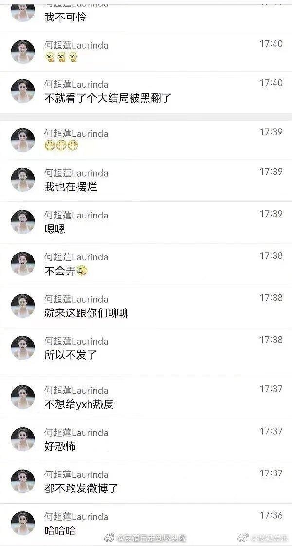 窦骁和何超莲被骂上热搜后,两人都没有就此事做出任何回应,原因是因为何超莲认为「感觉怎么样都要被骂」因为怕被截图,所以她话都不太敢说,只敢和自己人诉诉苦「好恐怖,都不敢发微博了」而且还暗讽「每天小心思一堆的正事不干的人,我还不敢举报」最后她只好安慰自己说,作为演员大家用作品说话,靠营销号红起来的人在演艺圈也走不了多久!