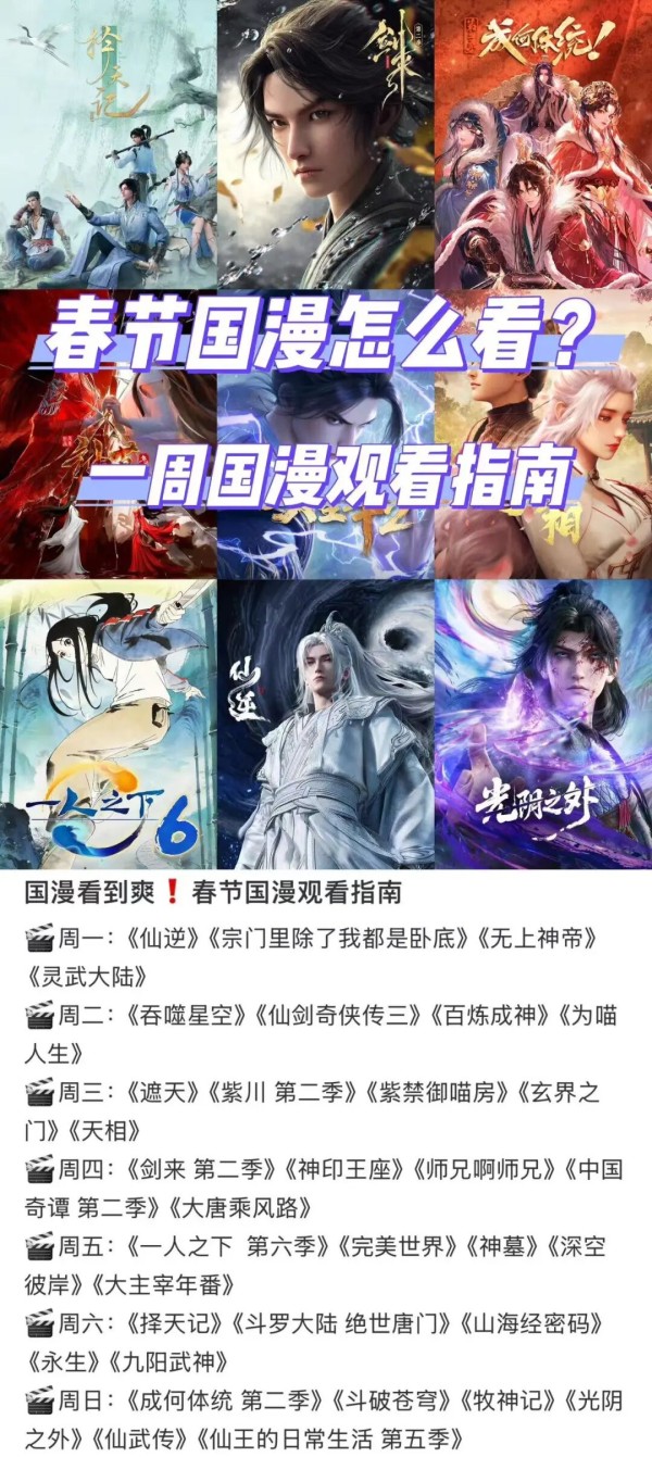 动漫这条线上,既有《咒术回战》《葬送的芙莉莲》这种级别的神作回归,提供给观众的是长期打磨后的世界观和人物关系,还有“稳定供给”的国漫,如《吞噬星空》《斗罗大陆Ⅱ绝世唐门》《师兄啊师兄》等年番按部就班地周更,用持续性陪伴维持黏性。对核心受众来说,一旦养成观看动漫的长期习惯,轻易就不会再改变。