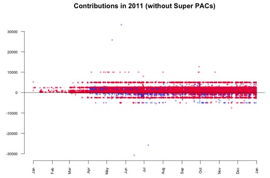 上一张图里另一个有趣的发现,就是可以看到向共和党候选人的捐款分别在5000美元和-2500美元有一条水平线。为了看得更清楚,我单独把共和党的捐款可视化。如果不进行可视化,是不可能发现这些内在的模式的,这里做出来的数据图也是对此最好的佐证。这些图是数据内在模式的完美实例,没有数据可视化,它们是不可能被发现的。