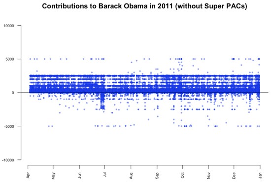 我们可以看到,向共和党候选人捐款的数值主要集中在5000美元,但实际去看一下数据你会发现,这样的捐款有1243笔,只占捐款总笔数的有0.3%,但因为其他的捐款数额随时间分布比较均匀,所以在这里才能看出这条线。有意思的是,个人的捐款限额是2500美元。因此,超过额度的捐款会退还给捐助者,这就是为什么在-2500美元的位置出现了第二条线。相反,对奥巴马的捐助没有呈现类似的情况。