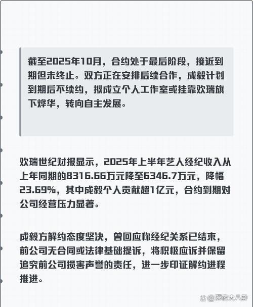 这更像是一次平静的商业解约。成毅走到那个阶段,他需要的东西变了,可能是更复杂的剧本,可能是电影节的红毯。欢瑞给不了这些,他们的核心产品目录里没有这一项。反过来,欢瑞要的稳定产出和成本控制,一个寻求突破的成熟演员也未必愿意继续提供。需求对不上了,分开是必然结果。