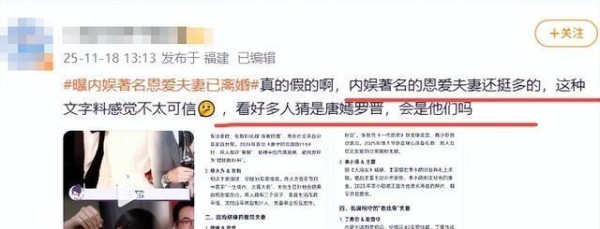 前脚还在为某个塌房偶像唏嘘,后脚一颗标着“著名恩爱夫妻已离婚”的重磅炸弹,直接在微博热搜上炸了个坑。