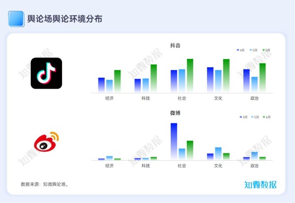 Q2,从具体舆论环境分布来看,经济、科技、社会、文化及政治类舆论强度在抖音短视频平台均有所上升;在微博平台,科技类舆论强度呈上升趋势,文化与政治类舆论强度波动上升。