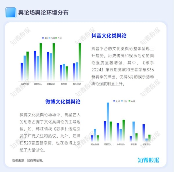 Q2,对于舆论场各空间文化类舆论来说,历史传统、娱乐活动舆论强度在抖音平台呈上升趋势;明星艺人相关内容在微博占据主流地位;此外,体育运动在抖音及微博平台均呈波动上升趋势。