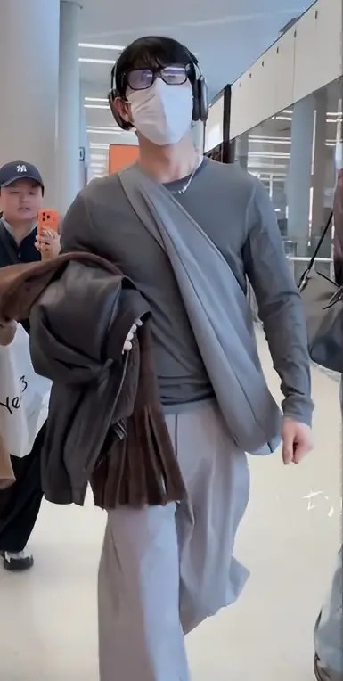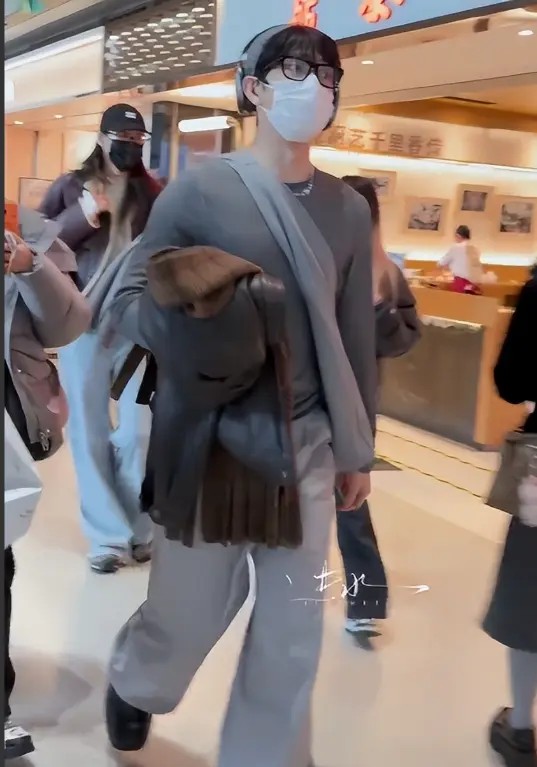 再看这次虹桥机场的同框,俩人的穿搭依旧藏着小心思。井柏然穿咖色皮质夹克,内搭浅灰色卫衣,下身配同色系休闲裤,黑色棒球帽、黑框眼镜、口罩、耳机四重遮挡,只剩眉眼轮廓能辨认;