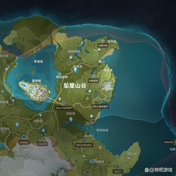 坠星山谷的范围囊括望风角、望风山地、果酒湖、低语森林、星落湖、摘星崖、千峰神殿和蒙德城,玩家在找风神瞳、挑战、仙灵、宝箱时专注这八个区域即可。