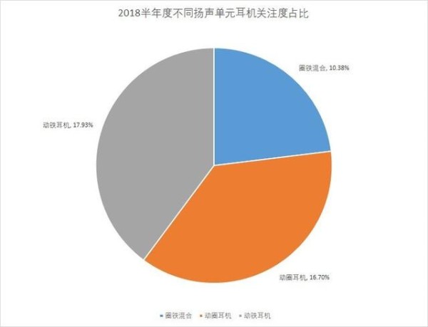 2018半年度耳机不同类型扬声单元关注度数据十分稳定,依然是动铁耳机和动圈耳机占据主流,圈铁耳机位列第三,与Q1相比三种类型的关注度占比几乎没有任何变化。这三种类型扬声单元的耳机在上半年均有不少新品推出,而且有一些素质还相当高,比如拜雅的DT240 PRO、飞傲的FH5、qdc的变色龙V3、拉赫曼尼的STELLA等等,特别是圈铁耳机,在经过大半年的沉寂之后,终于又有新品集中面世。这三类不同扬声单元耳机的关注度趋势在近几年内应该不会有太大的改变。