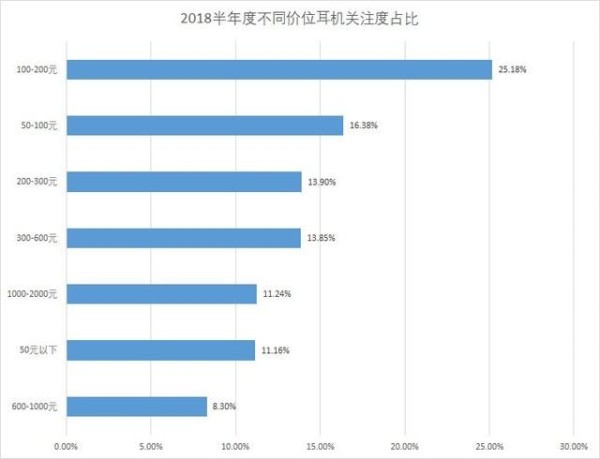 2018半年度不同价位耳机的关注度排名与Q1完全相同,具体占比数据也几乎没有什么明显的变化。100-200元这个价格区间依然是占据首位,也是关注度占比变化相对来说最大的一个,由Q1的31.42%降到了25.18%。1000-2000元、50元以下、600-1000元这三个价位的关注度占比则稍有提升。从Q1到半年度表现如此平稳,难道是人们购买耳机的整体意愿并没有增加的缘故?目前还不能下结论,需要在Q3进一步观察。