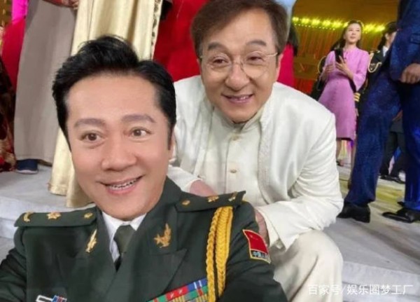 除了年轻人在幕后有着可爱的互动,老一辈的演员们也十分可爱,蔡国庆和成龙坐在台阶上,看来两位是累了。蔡国庆身穿军装,成龙则是一身中山装,合照的时候成龙把头凑过来十分可爱,就像两个小孩子一样。