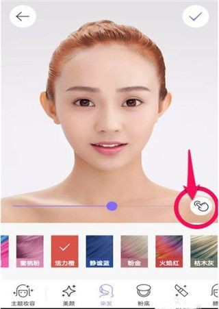 人脸识别完成后,大家点击屏幕下方的“染发”选项,此时会出现数十种发色供大家选择,大家可以慢慢尝试,选择自己喜爱的发色,软件会自动识别头发部位进行渲染