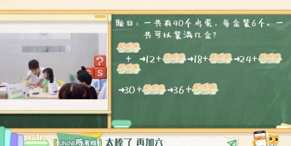 他立刻想到可以用题目分解法,通过加减的方式,一组6一组6的不断往上加,直到让雨希自己开心的说出了问题的答案。