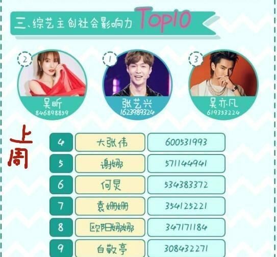 吴昕紧跟张艺兴,所以张艺兴的名次也从上一周的第一名到了第三名,张艺兴在这一周的话题度也吴昕一样减少了,但是他的其他的综艺节目收视率还是很可观的。除此之外章子怡、周冬雨、杨超越都纷纷上榜,章子怡被曝将会参加《妻子的浪漫旅行》第二季,网友对于这个消息是议论纷纷,众说纷纭。不知道大家会不会因为章子怡再看《妻子的浪漫旅行》了?