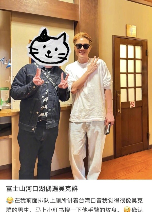 巧合的是吴克群同时间也在河口湖被偶遇了。下图是网友晒出的自己与吴克群的合照。