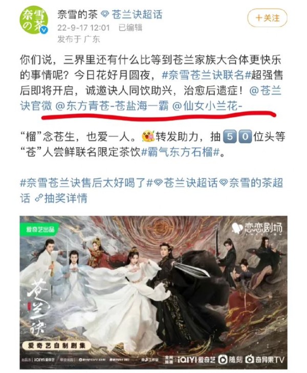 然而,人们除了关注这场声势浩大的成功联名之外,也在奈雪官微发布的微博中发现了一处不同寻常的细节:除了按照惯例艾特了苍兰诀官微,奈雪同时还艾特了@东方青仓-苍盐海一霸 @仙女小兰花- 两个角色号。
