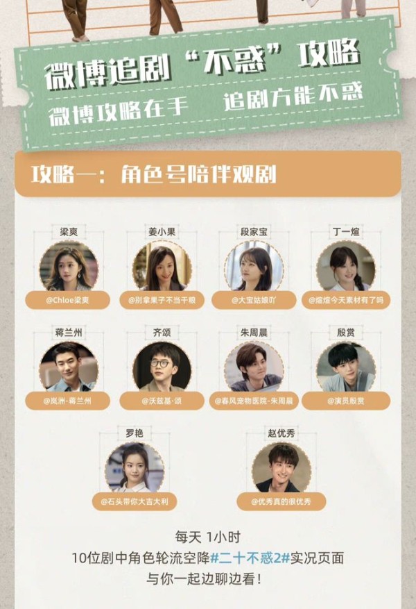 如二十不惑角色号推出了陪伴观剧的活动, @Chloe梁爽、@别拿果子不当干粮、@大宝姑娘吖 等10位剧中角色轮流空降#二十不惑#实况页面,每天1小时参与互动。受众仅需进入话题实况版页面,进行提问,就有可能会被翻牌。