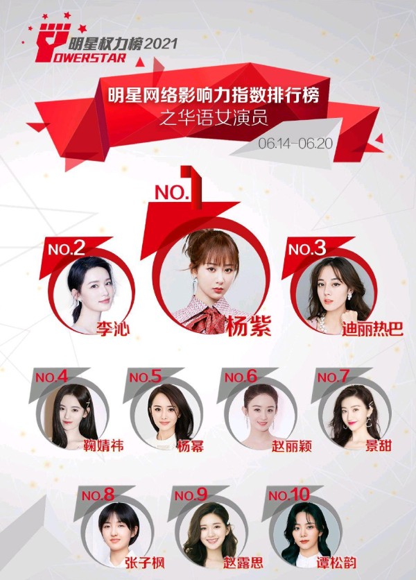NO.1 杨紫 NO.2 李沁 NO.3 迪丽热巴 NO.4 鞠婧祎 NO.5 杨幂 NO.6 赵丽颖 NO.7 景甜 NO.8 张子枫 NO.9 赵露思 NO.10 谭松韵。