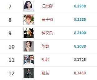 本期榜单第7~第12名依次是江疏影、黄子韬、钟汉良、陈数、胡歌以及靳东,其中没有作品在线的靳东人气迅速下滑,而胡歌凭借深厚的底蕴依旧保持着可观的热度,小编已经记不清胡歌“消失”多久了。